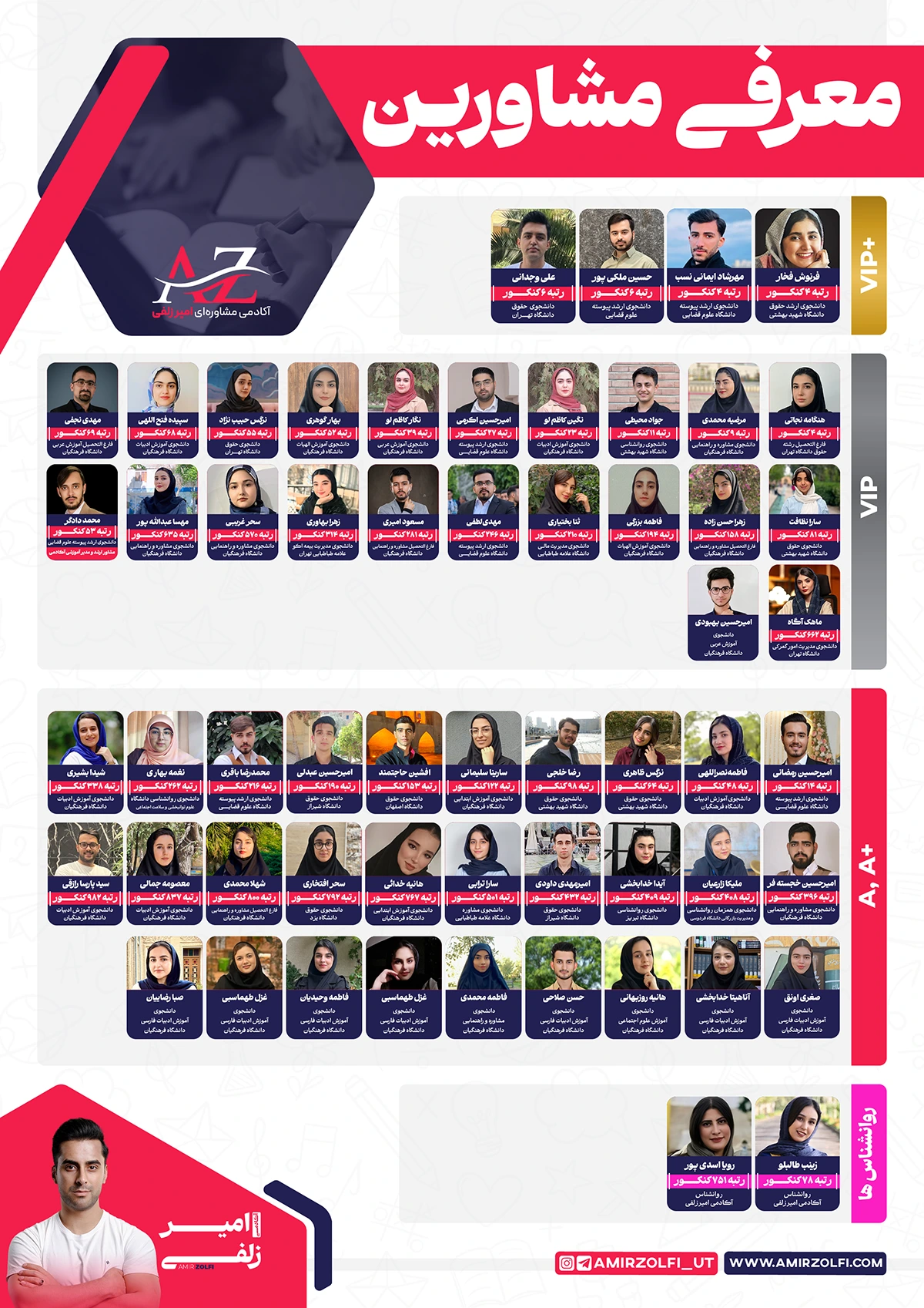 موفقیت توی کنکور انسانی یه مسیر یهنفره نیست! یه تیم حرفهای و کاربلد کنارته تا مطمئن بشی هر قدمی که برمیداری، درسته. مشاورای ما، خودشون این مسیر رو با موفقیت رفتن و حالا اینجان که تجربهشون رو با تو به اشتراک بذارن.